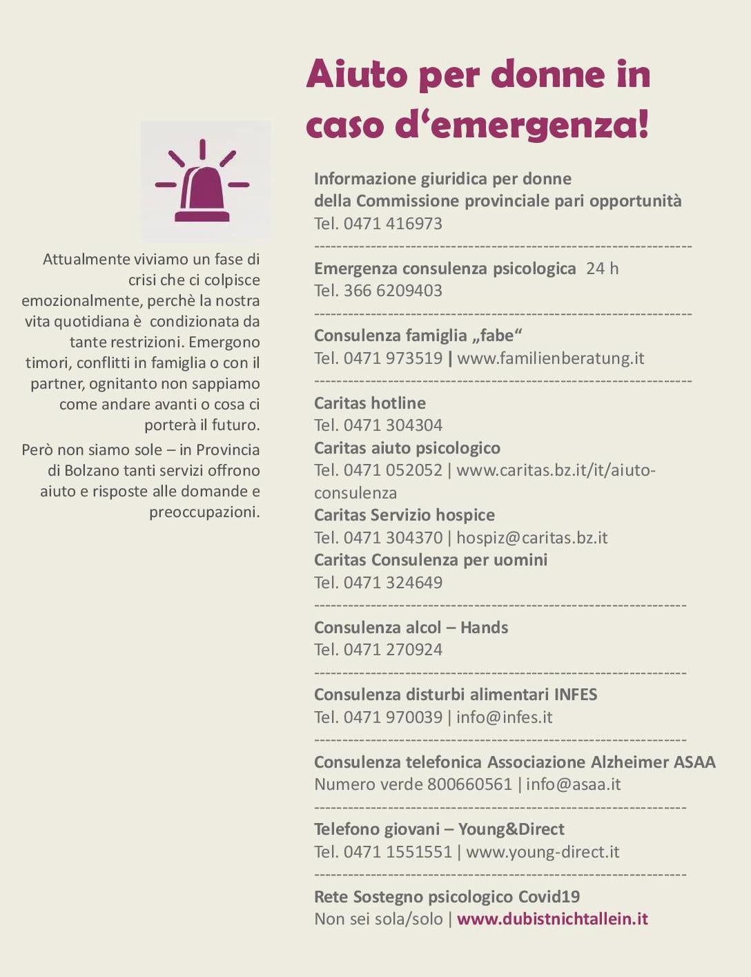 In situazioni di crisi possono emergere timori, incertezze, conflitti in famiglia o con il partner e talvolta le donne non sanno come andare avanti. Nonostante tutto, non sono sole - sul territorio altoatesino esistono servizi validi che offrono risposte alle domande e aiutano a superare le preoccupazioni.