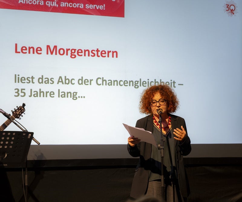 La nota scrittrice e performance artist Lene Morgenstern ha letto l'"ABC delle pari opportunità - per 35 anni" appositamente creato per il 35o anniversario della Commissione provinciale per le pari opportunità per le donne.